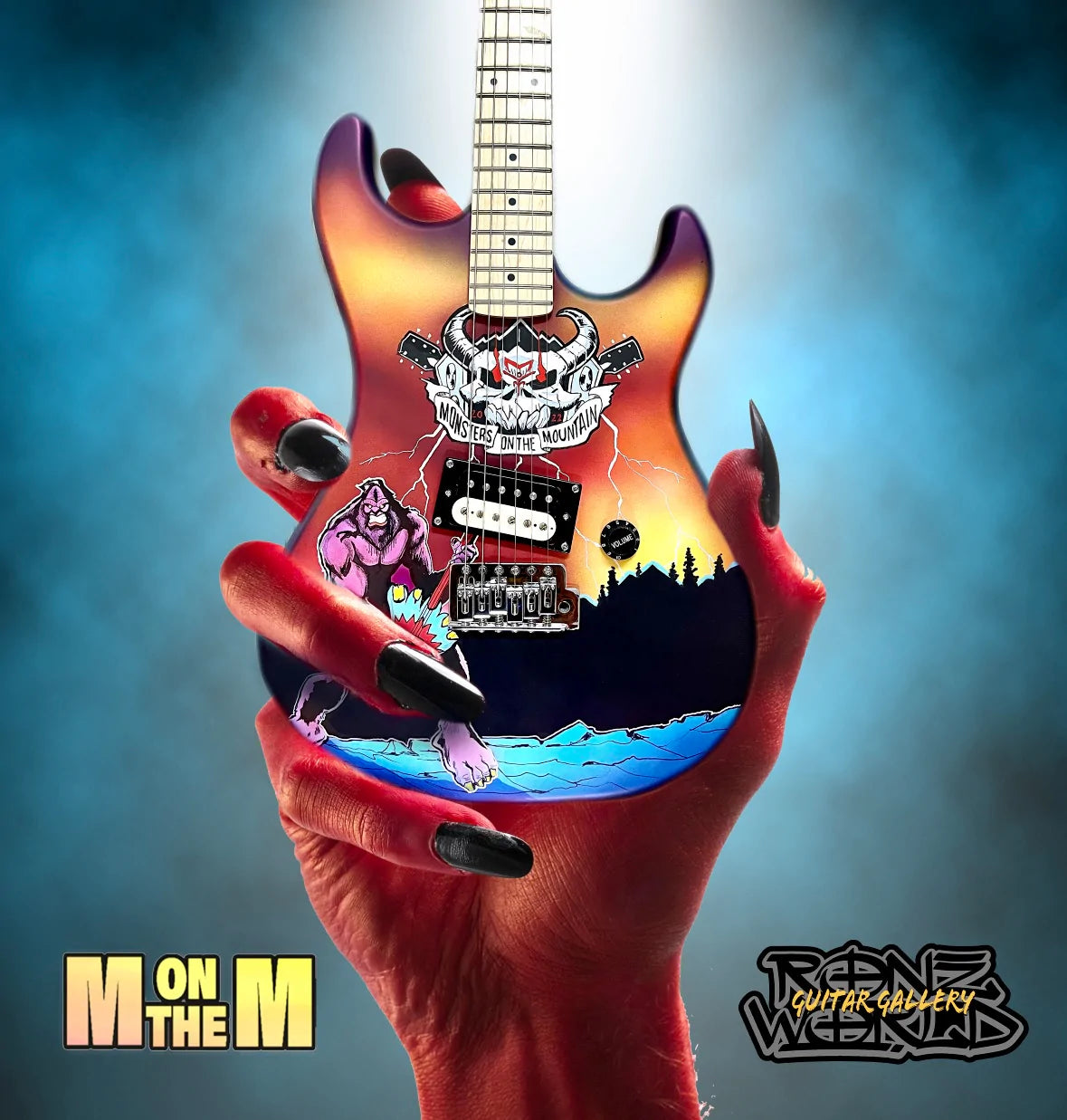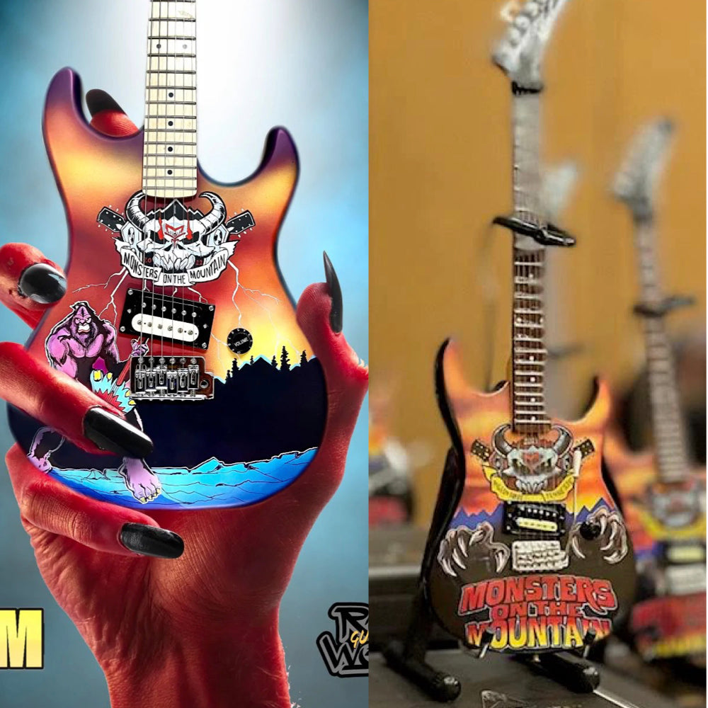 We have made a limited amount of exact miniature replicas of Ron's custom designed, hand painted Monsters on the Mountain guitar - and once they are gone...they are gone!