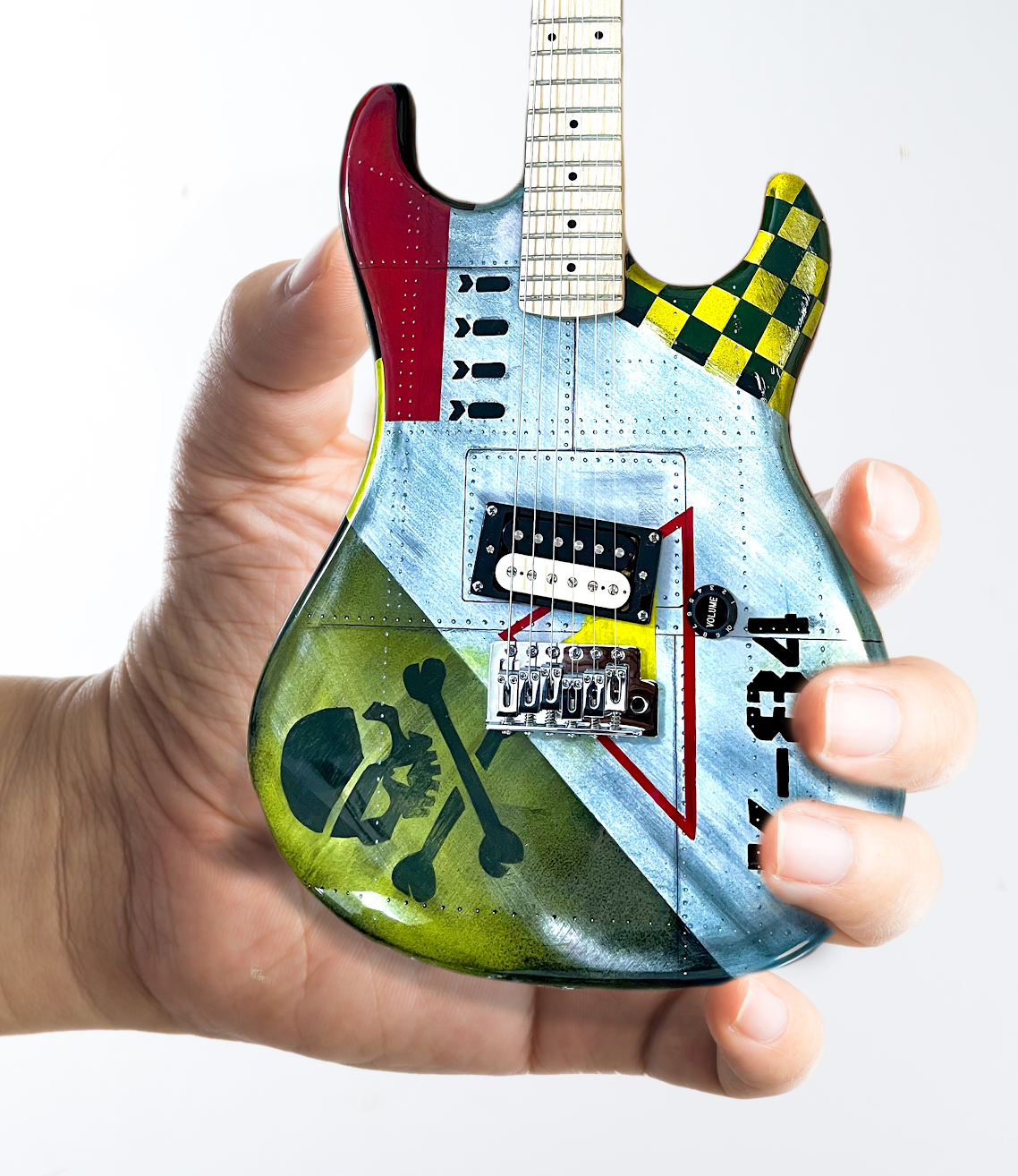 These mini guitars are exact replicas of Ron's custom designed, hand-painted full size Kramer K84 guitar.