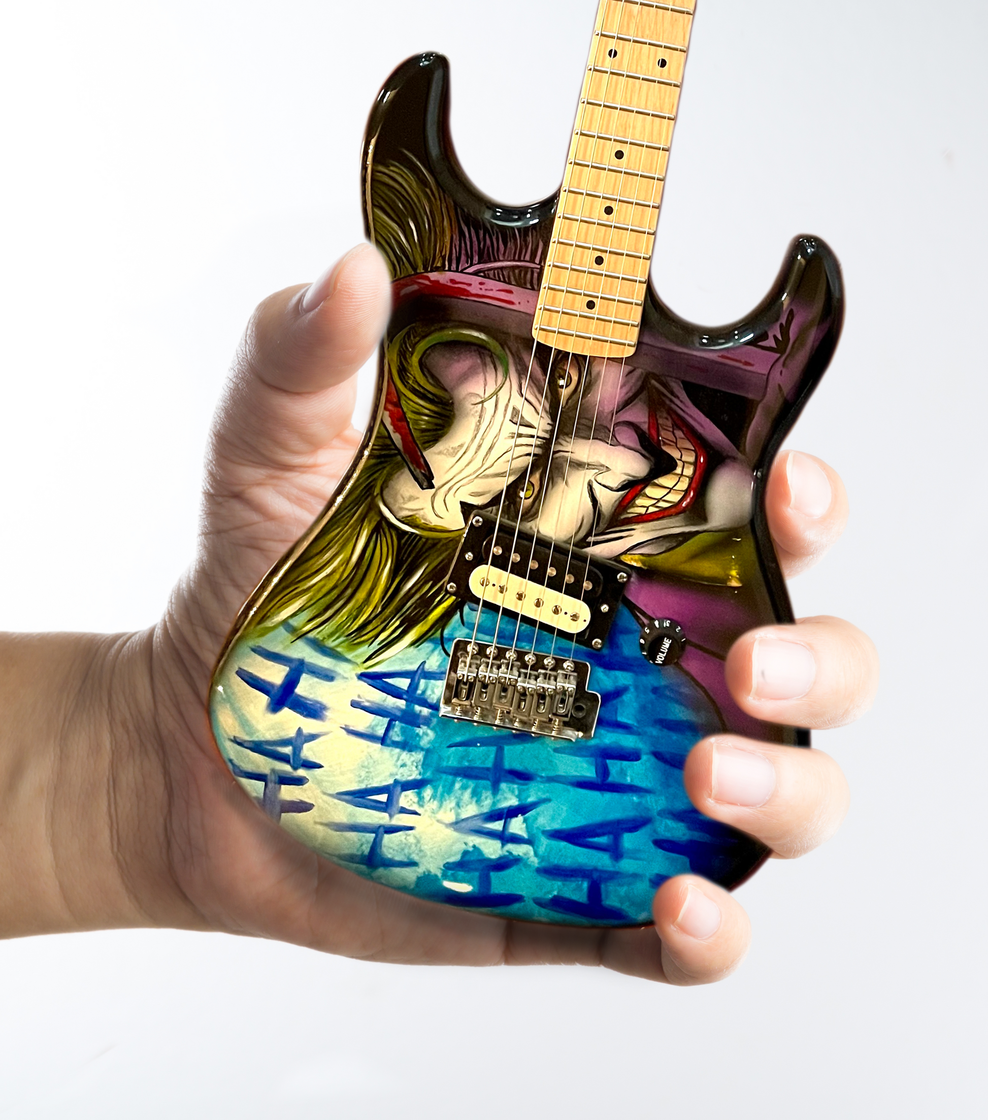 These mini guitars are exact replicas of Ron's custom designed, hand-painted full size Kramer Joker guitar.
